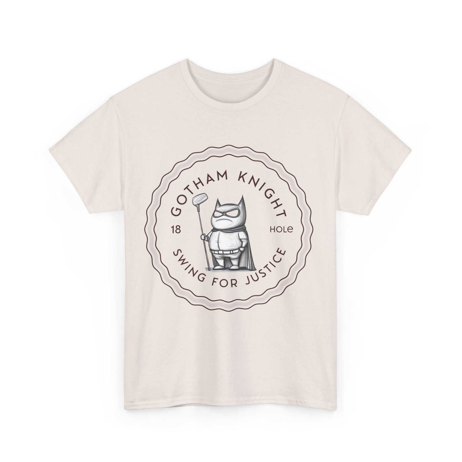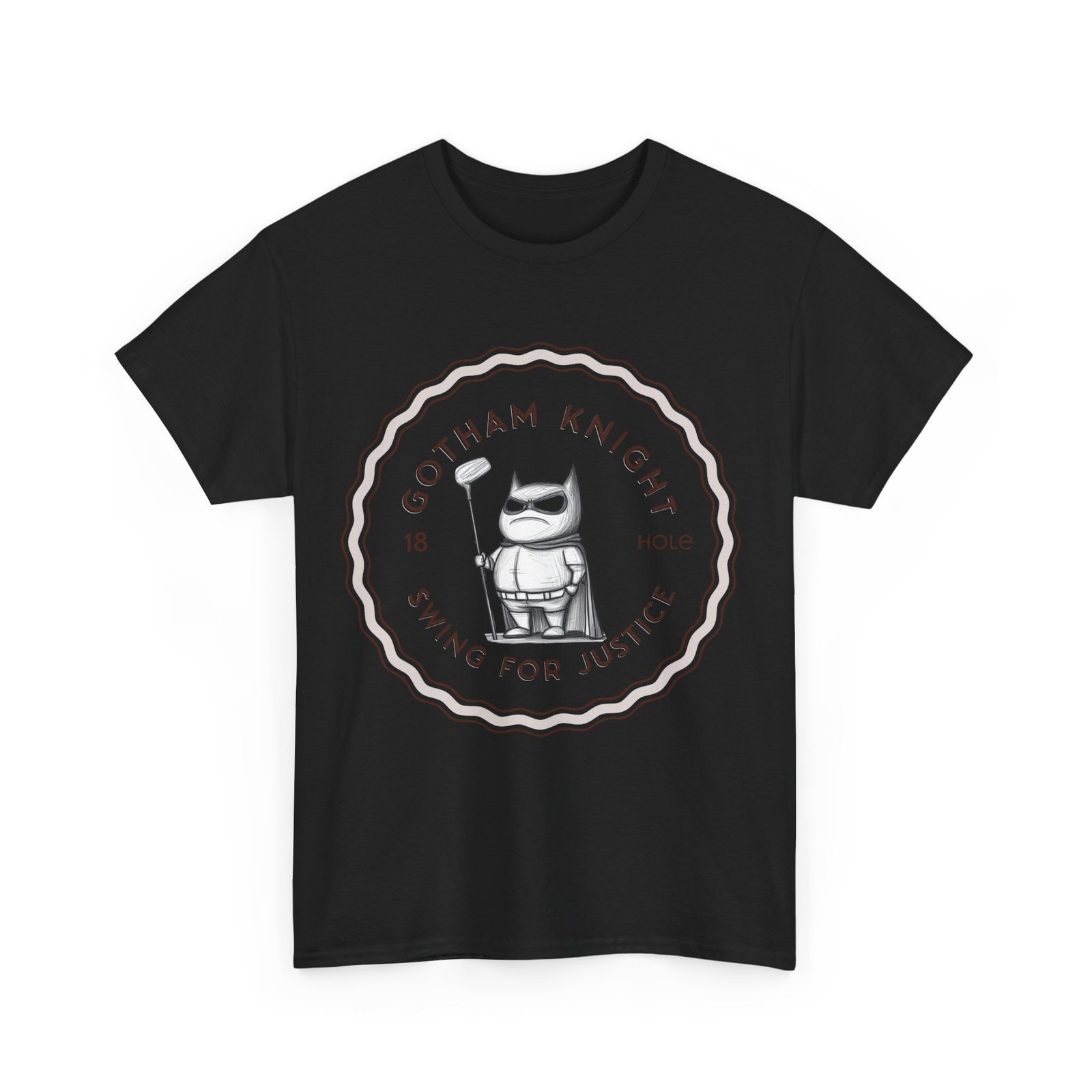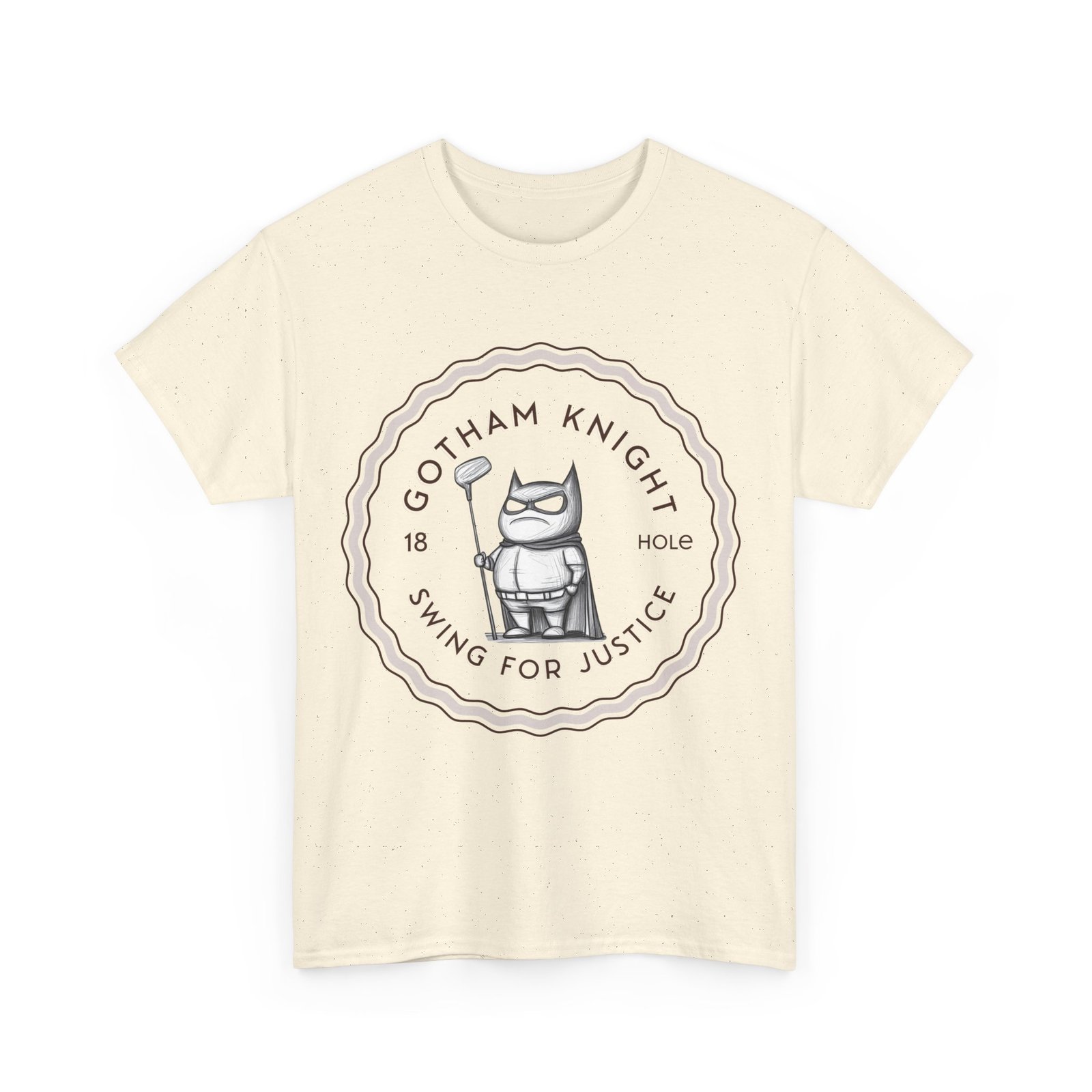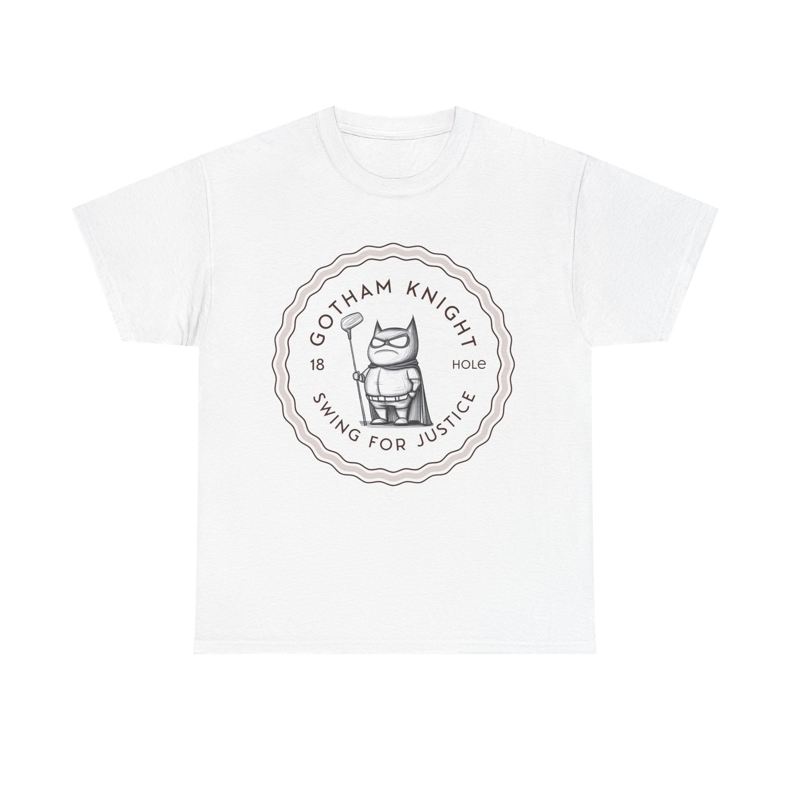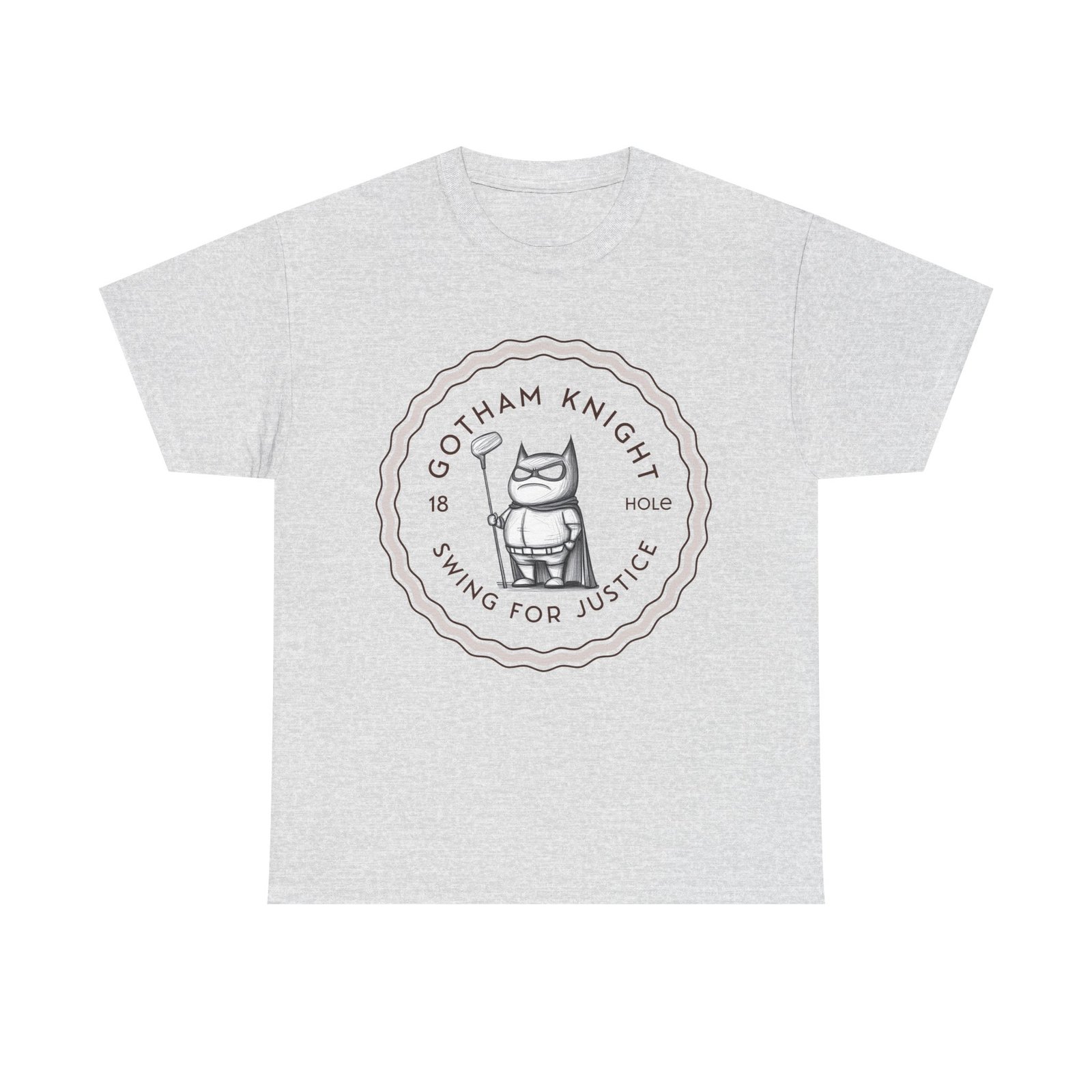 A tee featuring a design of Gotham golf club swing for justice, perfect for those who appreciate a touch of edginess in their casual outfits. This unisex heavy cotton tee is ideal for adults looking for a comfortable and durable shirt for year-round wear. It blends seamlessly into any occasion, offering a classic fit and a timeless look.