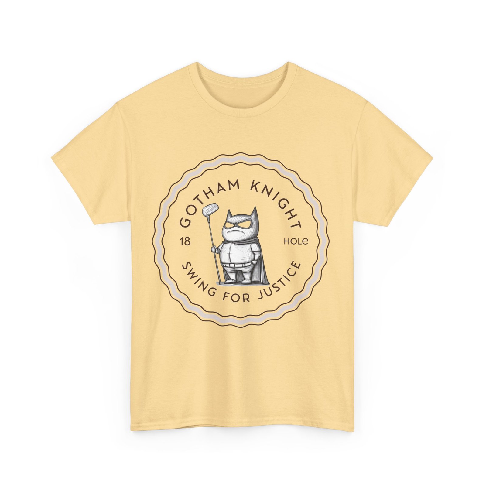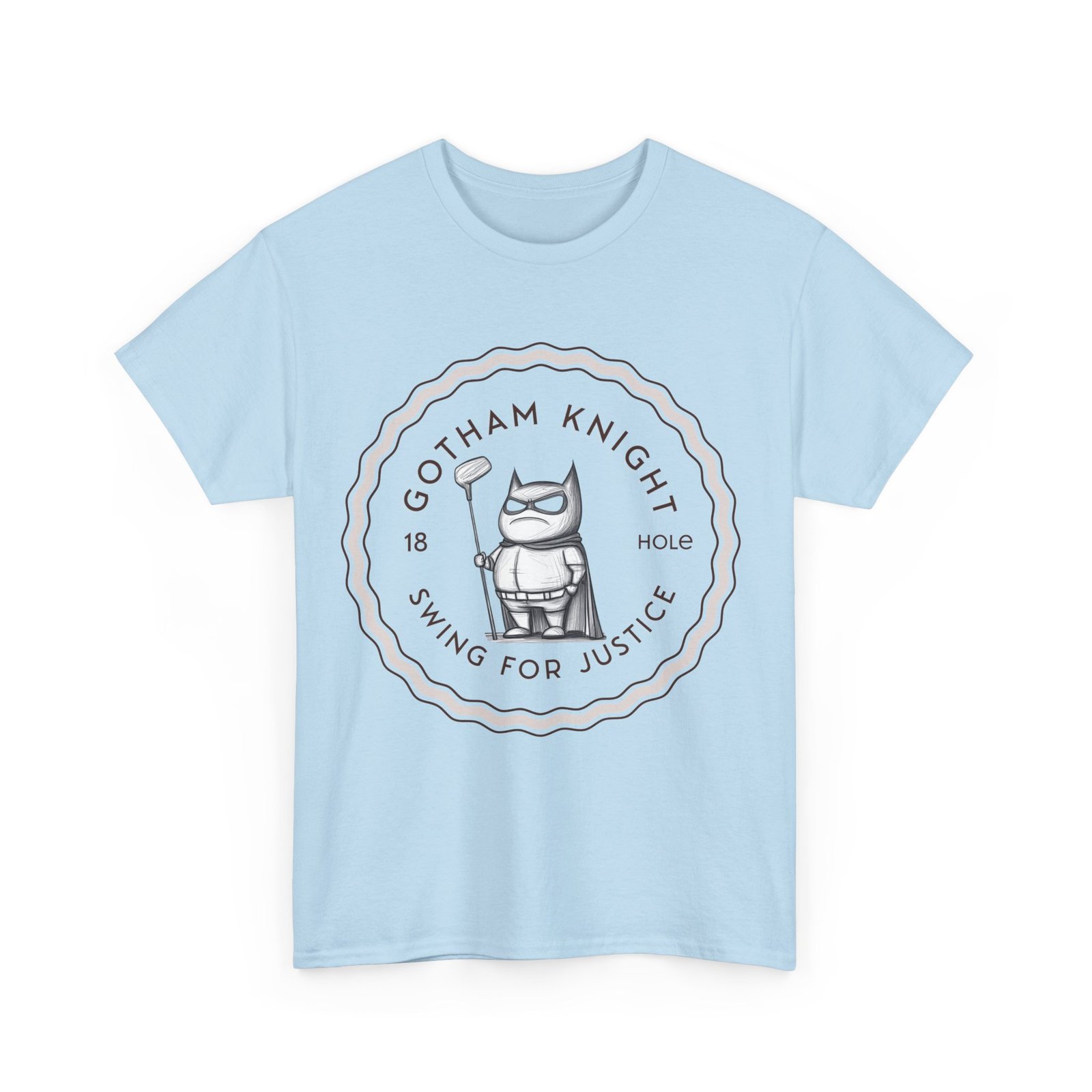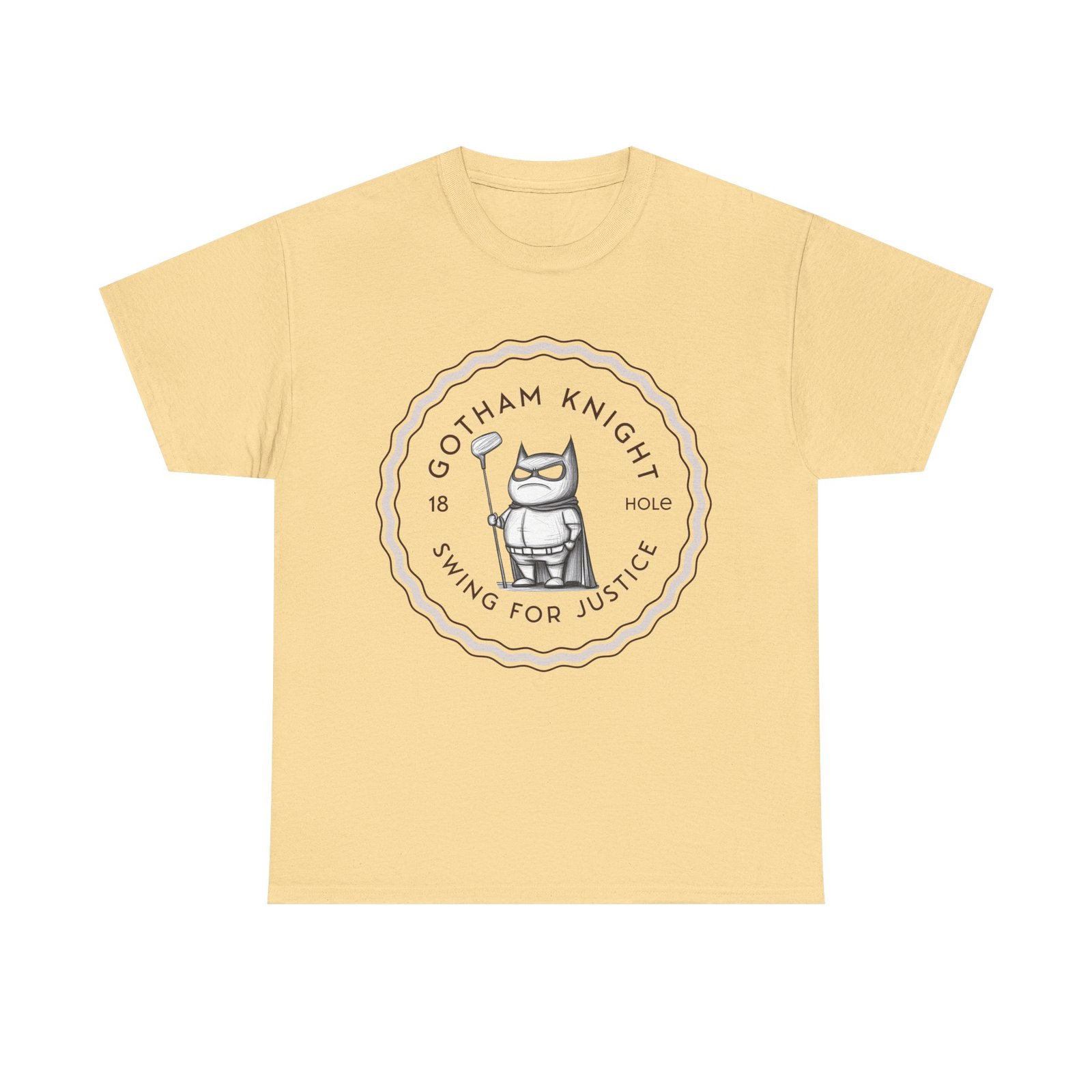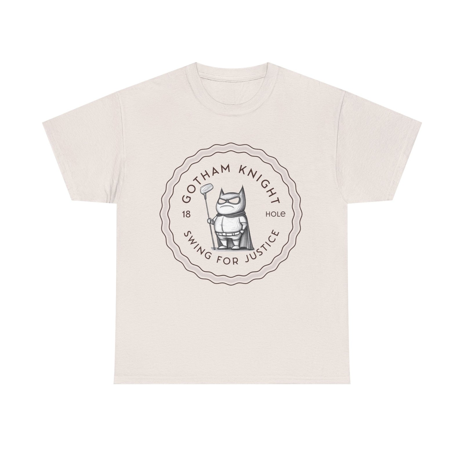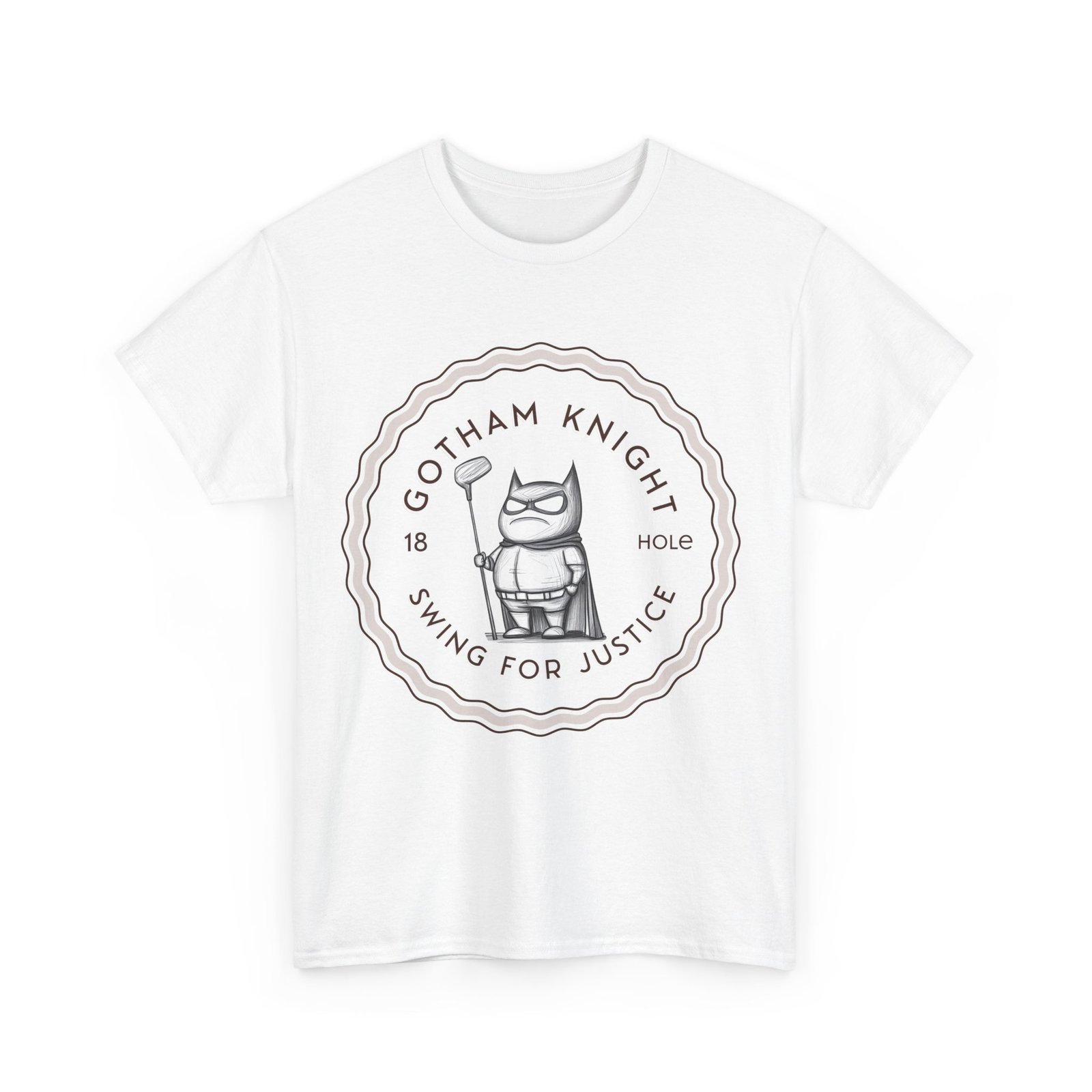 A tee featuring a design of Gotham golf club swing for justice, perfect for those who appreciate a touch of edginess in their casual outfits. This unisex heavy cotton tee is ideal for adults looking for a comfortable and durable shirt for year-round wear. It blends seamlessly into any occasion, offering a classic fit and a timeless look.